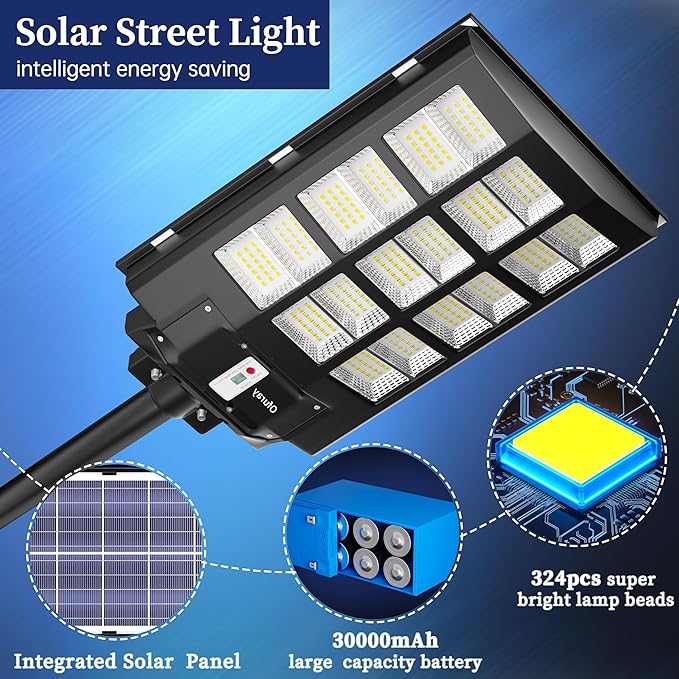 - 【Upgrade-Durable Led Beads】:This solar lights for outside uses 324pcs super-bright 5054 high-power led lamp beads(1pcs of our solar street light LED Bead brighten than 25 pcs otherordinary LED Lamp). It provides high brightness and low power consumption which makes street light more energy efficient, longer life and safer to us