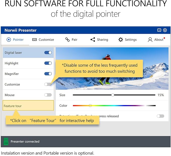 - Highlight and magnify - An advanced digital pointer system can highlight or magnify areas of focus in pixel-perfect detail. These functions are enabled via Norwii Presenter app
