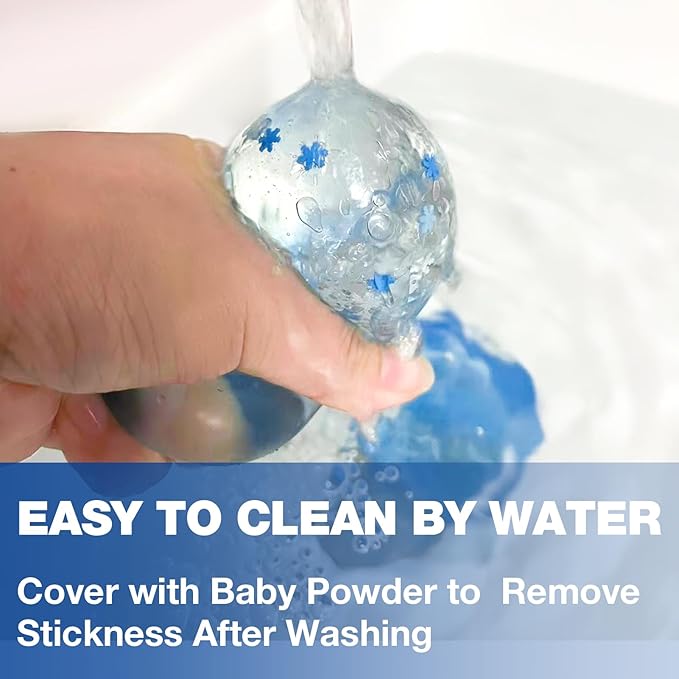 - 【NOTE】 These ics squishies can be as a splat toy too ,you can "splat" them to the floor,if you don't like the sticky feeling ,we recommend washing these mini ice cube stress balls with dish soap and warm water, air dry, and then lightly apply a small amount of baby powder or flour to remove the stickness of these stress balls ice toys.