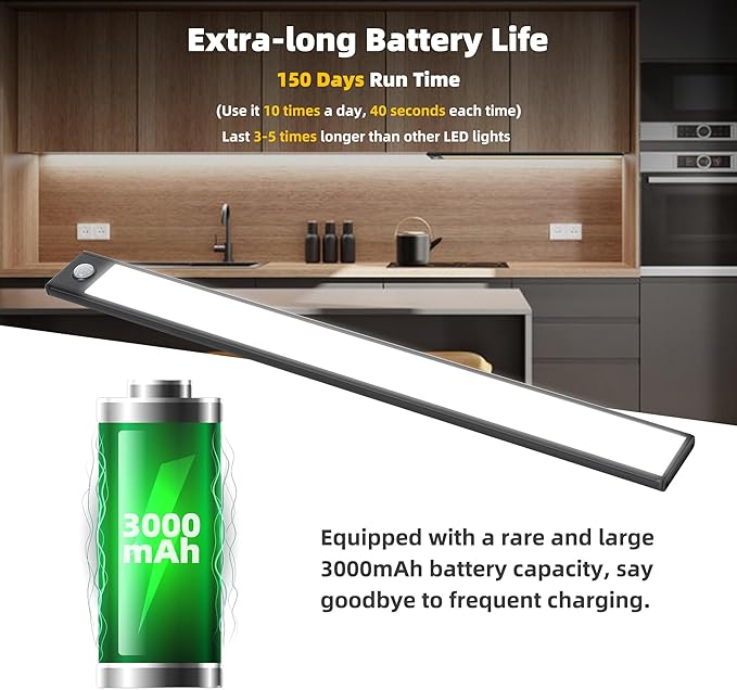 - 【USB Charging, No Battery Required】Charge the under cabinet lighting by plugging the included USB charging cable into a PC, socket, or power bank. The inbuilt 3000mAh lithium battery about 5 hours to get a full charge and powers the LED light for 1.5 to 2 months (if the light is activated five times a day). Charge occasionally but benefit daily.