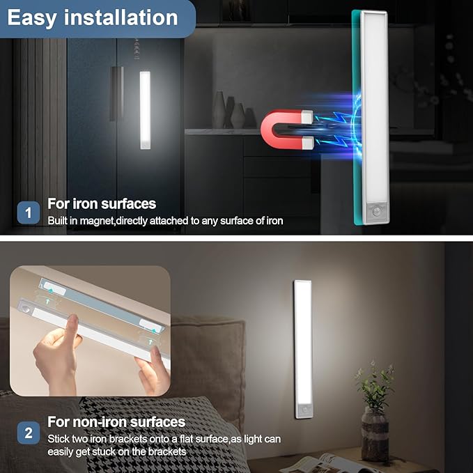 - Magnetic adsorption:During installation,there is no need to borrow any tools. With the help of the powerful magnet inside the closet light,it can be magnetically adsorbed onto the refrigerator or any metal surface,or it can be easily installed using portable tape