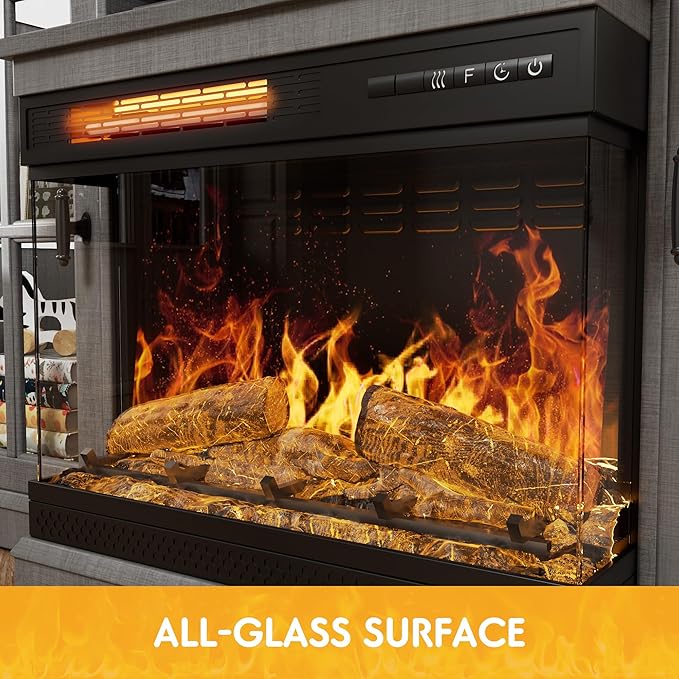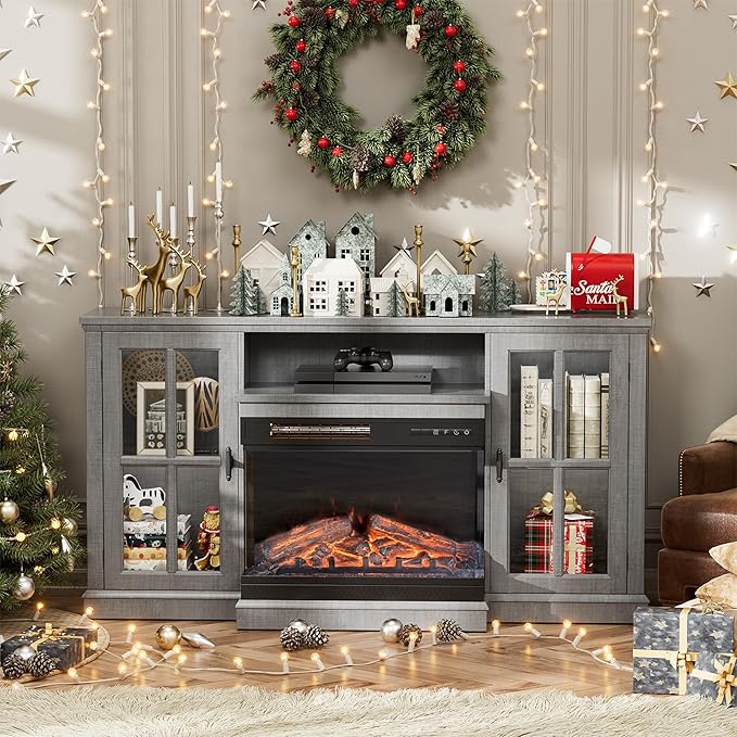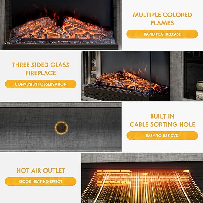 - Immersive Fireplace Experience: Designed for 65" TVs, this 59"(W) x 13.7"(D) x 31.6"(H) console offers expansive storage for gaming consoles, sound systems, and media accessories. Features a built-in 26" 3-sided panoramic fireplace with lifelike flames and smart temperature control, delivering warmth and ambiance while ensuring safety during movie nights or gatherings.