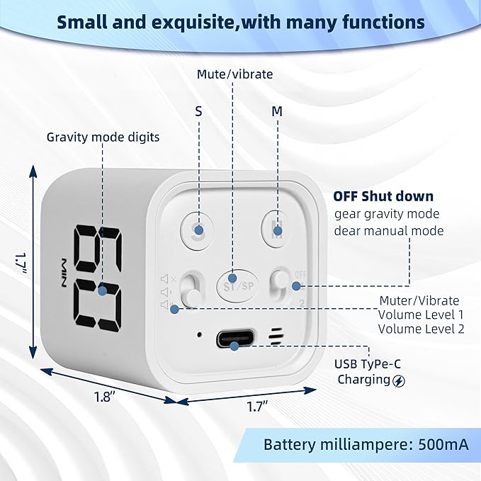 - COMPACT AND RECHARGEABLE: The timer measures 1.8*1.7*1.7 inches, fits in the palm of your hand, and weighs only 1.68 ounces. It's portable and fits into any pocket or bag. It is rechargeable, has a durable lithium battery and USB-C charging port, saving you the extra cost of buying batteries and taking a step towards environmental protection