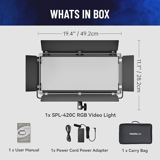 - 【Easy to Use & App Wireless Control】Designed with portability in mind, the slim, lightweight Smart Panel Light SPL420C features a generous color temperature range from 2800 to 8000K with RGB capability. Choose from a full RGB wheel of color options, HSI mode, and special lighting effects. Mettle Lighting App allows you to remote control the SPL420C from your phone. You will have full access of all functions right in your palm. Moreover, multiple lights can be assigned in one group and wireless