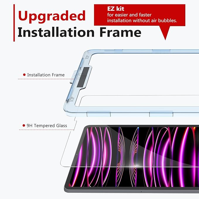- Innovative Installation Frame: Contains an innovative installation alignment frame for efficient bubble-free installation without any experience. The screen protector itself has strong adsorption and automatic exhaust function, which makes the installation easier and faster. Please read the instructions or watch the installation video carefully before installation. Please note: Clean the oil and dust from the screen surface before install and align it properly
