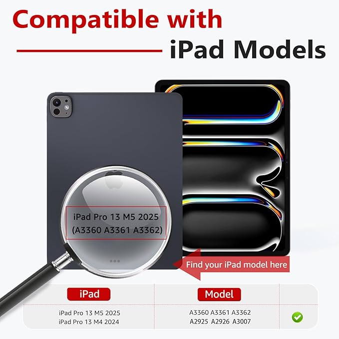 - Compatibility: Specifically compatible with new iPad Pro 13 Inch M5 2025 / M4 2024. Compatible Models: A3360/A3361/A3362/A2925/A2926/A3007. Please check the back bottom of your iPad to find the model number before purchasing