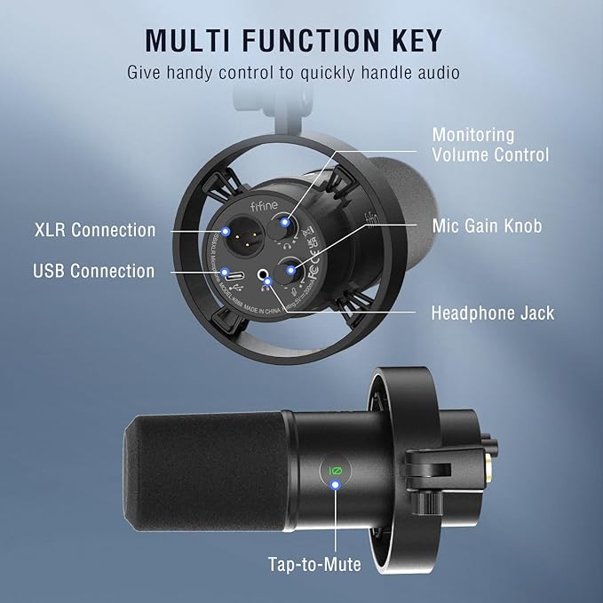 - [Mute and Monitoring] No need to fiddle with software settings on your computer, you can mute the USB microphone for PC via tap-to-mute button to avoid sudden situations. Adjust the gain knob on the podcast mic to fine tune the audio for a moderate level. The headphones monitoring jack paired with the monitoring volume knob allows you to stay informed of the situation on the recording studio microphone, making your recording more effective.