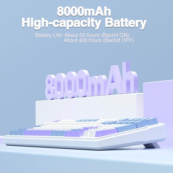- PBT Keycaps and 8000mAh Battery: 99 keys 96% layout compact keyboard can save more desktop space while keep necessary arrow keys and number area for games and work. The rechargeable keyboard built-in 8000mAh large capcacity battery to provide more power and longer battery life. Double shot PBT keycaps, made from two colors material molded into each others, make the keycaps characters maintain the vibrance and saturation, clear and not fade