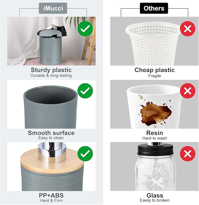 - POWERFUL FUNCTION:①8L Trash can rotate 360°lid.②Toilet brush with cover,prevent water splashing on your hand.③Double-layer drain design soap dish,removable,dry and easy to clean.④Qtip Holders are the perfect organizer for cotton balls,cotton swabs,and floss picks.⑤Soap dispenser,toothbrush cup,and toothbrush holder are a perfect complement for Bathroom.