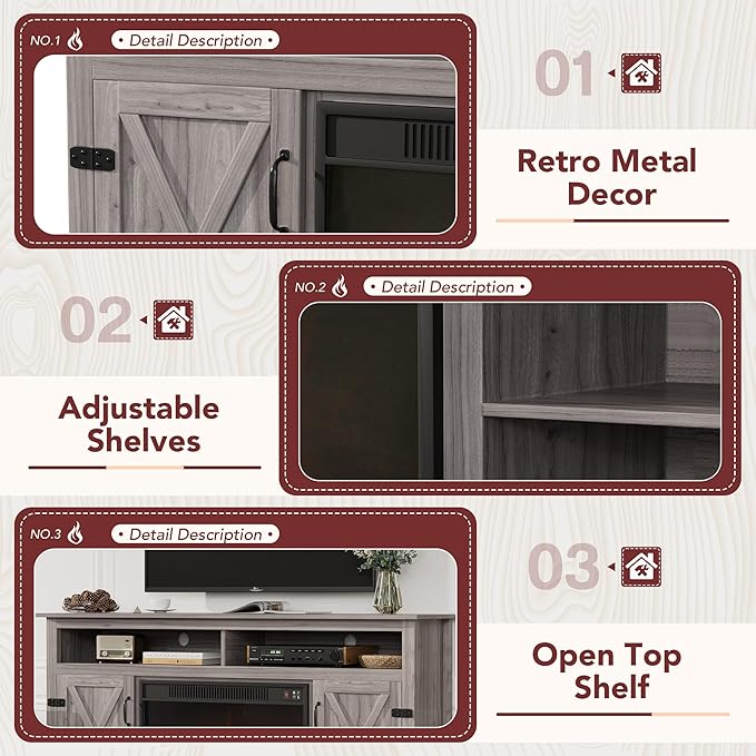 JUMMICO Fireplace TV Stand for TVs Up to 65+ Inch Entertainment Center with Open Storage Shelves and Side Cabinets, Media Console Table with Barn Doors for Living Room (Grey)