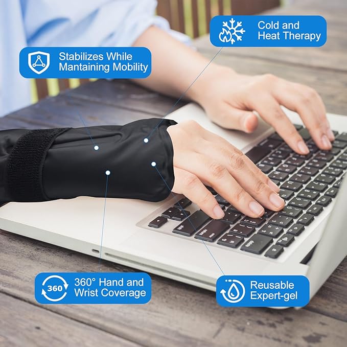 - Full Coverage Hand Wrist Thumb - The Blobuste Wrist Ice Pack Wrap is a versatile and reusable solution for hand injuries, including carpal tunnel, arthritis, and tendinitis. With a gel compression support system, this flexible hot and cold wrist brace provides instant pain relief and muscle therapy. Perfect for both men and women, this wrist ice pack wrap for swelling is designed for hands-free application, allowing you to maintain full range of movement during use.