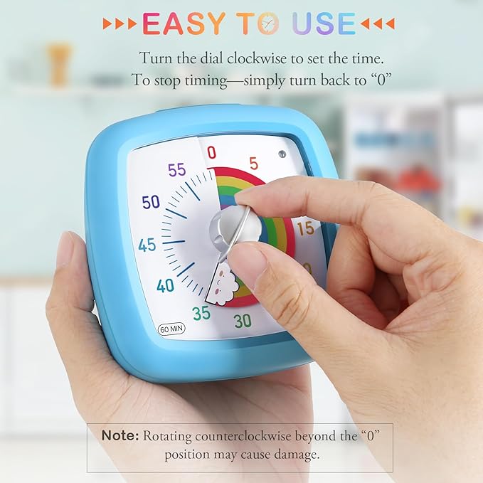 - Novel Rainbow Design: The new model visual timer uses a rainbow pattern to capture kids' hearts, and easily visualize the passage of time with a decreasing rainbow pattern, helping them complete tasks on time