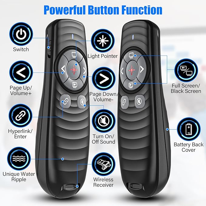 - COMFORTABLE GRIP & UNIQUE APPEARANCE: Presentation clicker features an ergonomic shape with thoughtfully designed contours that make it comfortable to hold, which can make you will not feel uncomfortable even if you use it for long speeches. The button is made of silicone material, which makes it feel comfortable when pressed. Powerpoint clicker with a unique water texture so make your wireless presenter even more unique