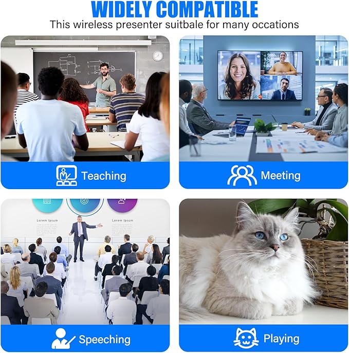 - WIDELY APPLICABLE: Wireless presenter support system: Windows 2003/XP/Vista/7/8/10/11, MacOS, Linux, Android. Supported software: PowerPoint, Keynote, Prezi, Google Slides, etc. Wireless Technology: 2.4 GHz. Product class:Class 3R. Maximum output:<5 mW. Package Include: presenter clicker with USB receiver x 1,user manual x 1. (AAA Battery Not Included). please to contact us if you need help or loss USB receiver. (Not recommended for LED, LCD, TV screen)