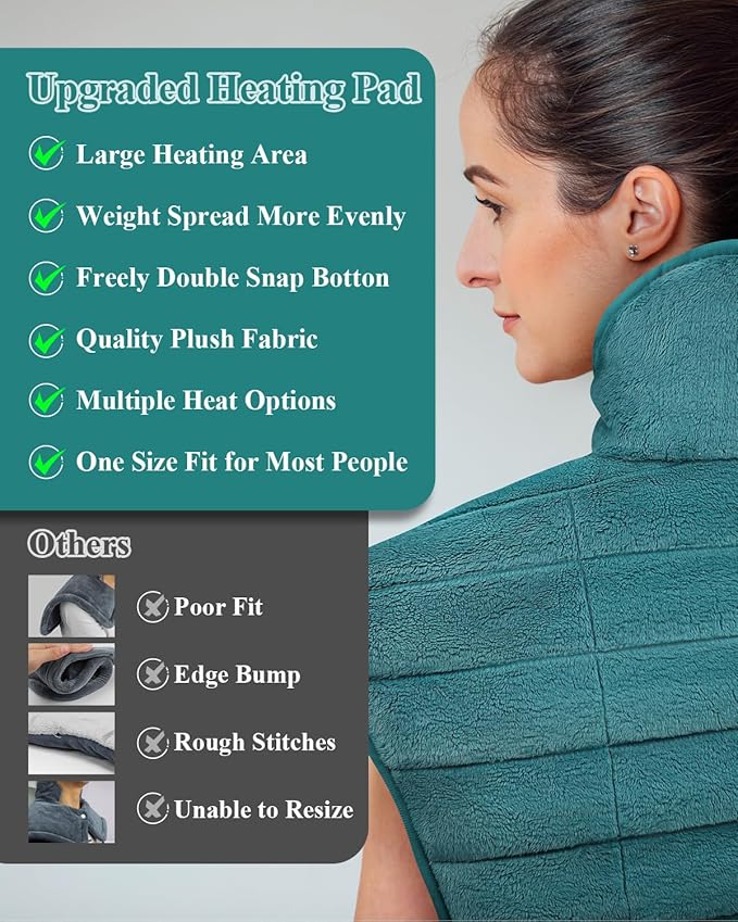 - Experience Enhanced Comfort with Extended Back Heating and Double Snap: SNUGYOURT heating pad with extended 24"x23" back design targets your neck, shoulders, and upper back, providing comprehensive relaxation and pain relief. The two choose one double snap button allows you to customize the collar size for a better fit easily(No need to button up both). Unique and premium gifts for women and men to express the warmest love to her and him. Mothers day gifts for mom and fathers day gifts for dad