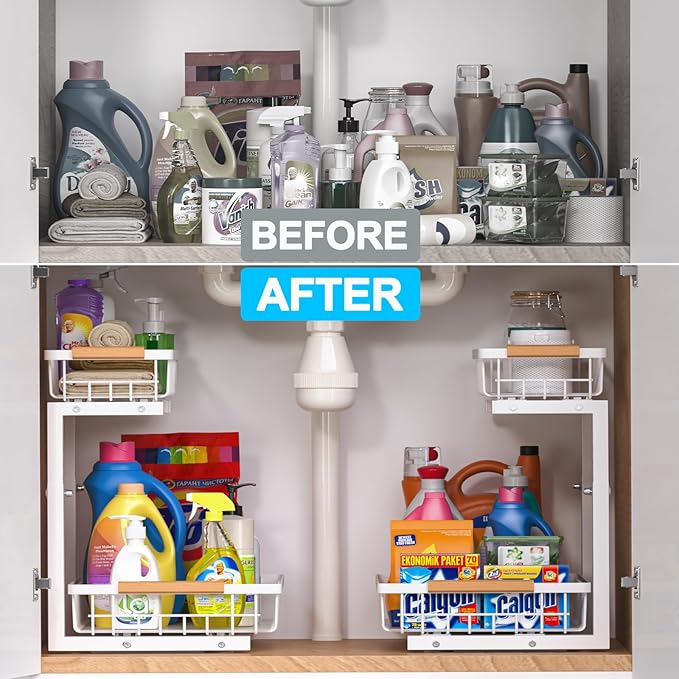 - 2 Tier Pull Out Baskets: Liuoud under sink shelves adopt upgraded round rails that slides out smoothly without jams or noise. Both Upper and lower drawers can slide out, which is perfect for accessing items deep in lower cabinet