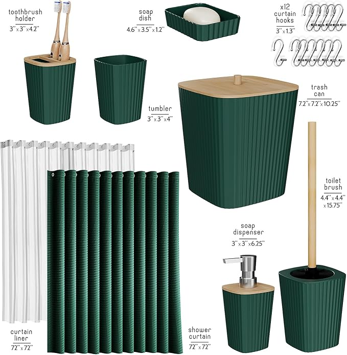 - Complete Bathroom Set: Toothbrush holder, tumbler, soap dispenser, soap dish, bathroom trash can, toilet brush and holder set, and fabric shower curtain set with clear shower curtain liner and 12 shower curtain hooks.