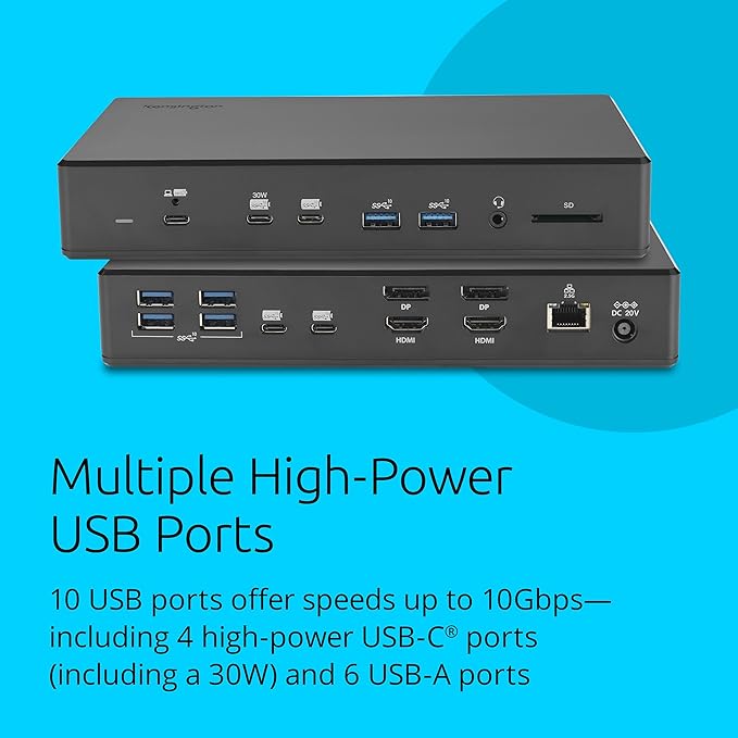 - 10 USB ports offer speeds up to 10Gbps. 4 high-power USB-C ports include 1 x ultrafast 30W port ideal for iPad/phone charging and 3 x 15W ports ideal for phone/headphone charging. 6 x 4.5W USB-A ports are available for keyboards, mice, webcams, thumb drives, and other peripherals