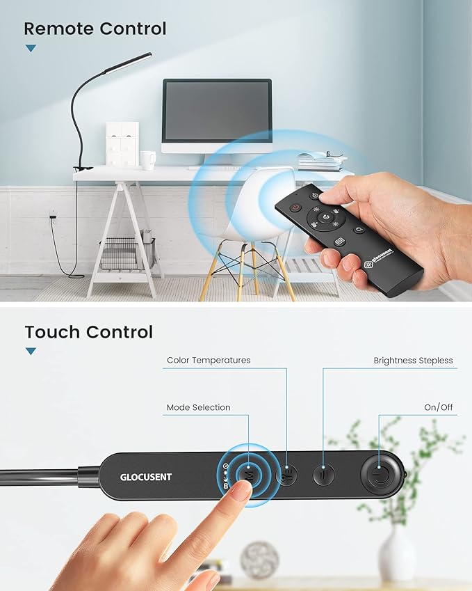- [Glocusent Commitment] We're confident you'll love our multi-purpose desk lamp, which is why we offer a 30-day happiness promise & a 24-month coverage. 1.The unique design is protected by an original patent. 2.FCC, CE, RoHS, PSE, C-TICK certified. 3.Contains 1*Clip-On Light 1*Remote 1*User Manual 1*Bookmark 1*USB AC adapter (2-prong 5V/2A) 4.The 59 inch cord is long enough for daily use. Glocusent offers a seamless blend of quality, innovation & customer-centric service.