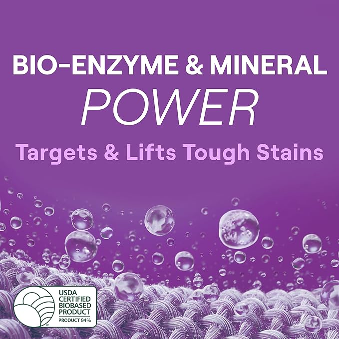 - Made with triple bio-enzymes and mineral power to fight odors and stubborn stains like chocolate, dirt, and grass.