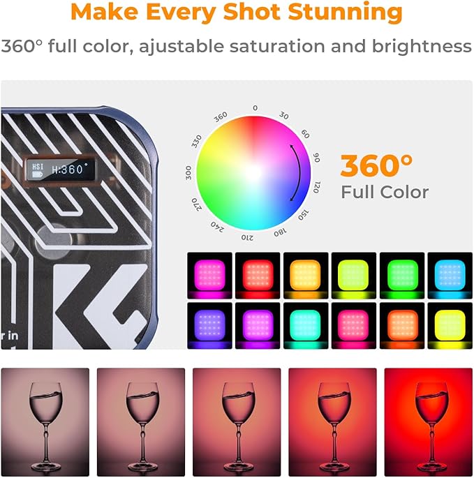 - 【Two Lighting Modes】The L01 RGB Portable Photography Light features two lighting modes: CCT mode, supporting color temperature adjustment from 2500K to 9900K, with brightness adjustable from 1% to 100% infinitely; and HSI mode, allowing hue adjustment from 0° to 360°, enabling you to select the hue and saturation according to your needs, thus helping you to capture various effects in photos and videos. It also comes with 21 built-in light effect modes to add fun and creativity to your lighting setup, enhancing your ability to shoot diverse scenes with different atmospheric effects in videos.