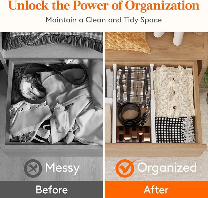 - Multipurpose: These drawer organizers for clothing can be installed in any drawer of your house or office; Perfect for organizing clothes, kitchen utensils, office supplies, makeup, bathroom clutter, and more; Our divider is patented (Patent No: US12133593B2) for a unique experience