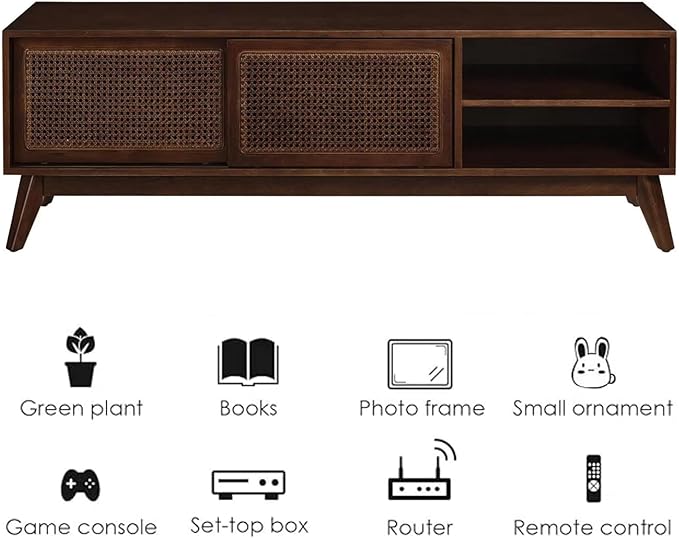 - 【Mid Century Modern TV Stand】This TV cabinet with storage blends modern and bohemian styles. Four solid wood legs provide strong support for our cane-made TV cabinet. In addition, plastic adjustable feet on the legs adjust the Angle to maintain balance and avoid scratching the floor.