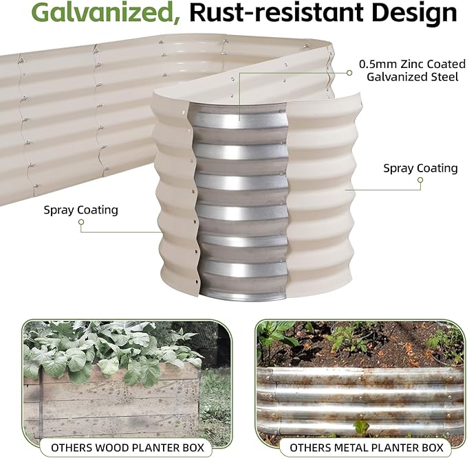 - 【 Rust-Resistant and Durable 】Planting bed is made from high-quality galvanized steel, effectively preventing rust and significantly extending its lifespan.Garden bed is treated on both sides with a non-toxic coating, ensuring safety and reliability. This construction not only enhances corrosion resistance but also provides excellent strength and stability, better resisting moisture and soil erosion. Additionally, it improves the aesthetic appeal of the product, meeting various gardening needs.