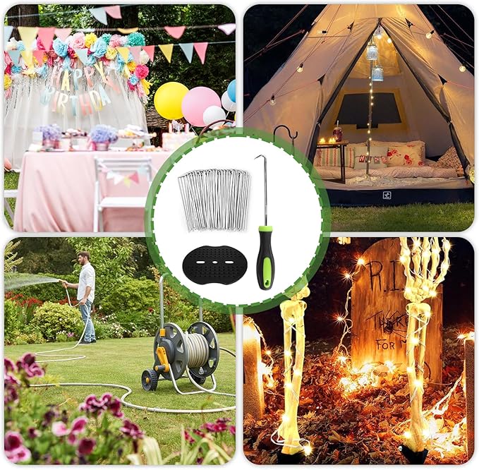- 【Multiple uses】Our lawn stakes will become the best gardening tools and improve the fixation of your patio, terrace, garden, raised bed and landscape projects. Great for securing grass sod, fabric, turf, fences, weed barrier, outdoor wires and ropes, tents, tarps, garden cloth, hoses, and much more.