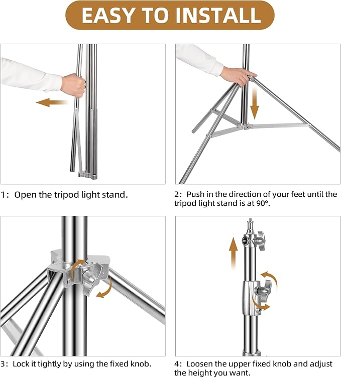- [Photography Light Stand Kit]: 1 × heavy duty light stand and 1 × carry bag. Notice: When you install tripod stands, be sure to fully open the tripod until the connecting piece is 90°to the tripod.