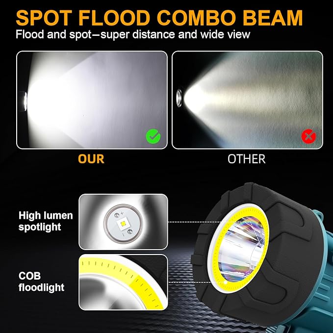 - SPOT FLOOD COMBO LIGHT: This extra bright LED spotlight + COB Floodlight casts a high lumen beam out to an incredible 550 yards and a wide view. The COB floodlight compensates for the narrow beam of the spotlight, can be used alone as a work light. LEDs boast an extended 50000-hour lifespan. Features 6 adaptable settings: Spot+Flood / Spot High / Spot Low / Flood High / Flood Low / SOS(Long press 3 seconds).