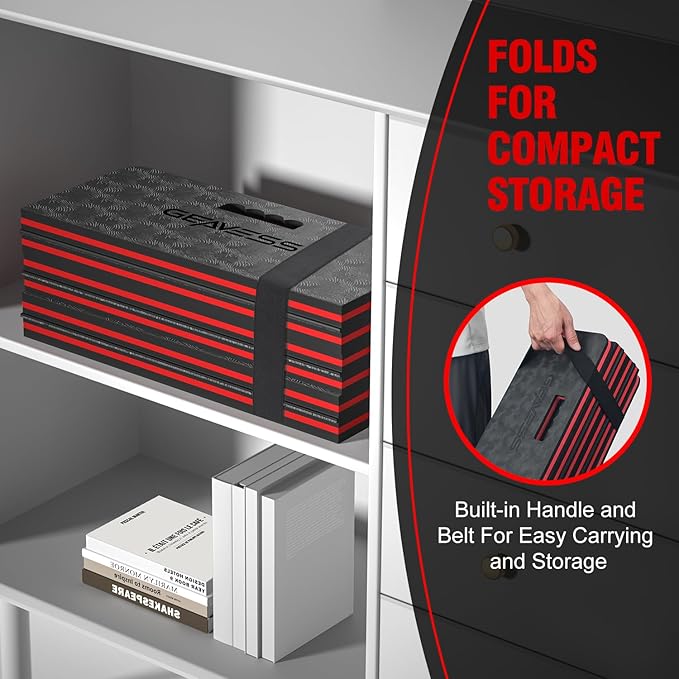 - ✔️【Convenient Handle & Storage Belt】: The folding kneeling pad is designed with a built-in side handle and an elastic belt for easy transport and compact storage. Quickly fold and store the mat in car trunks or tight spaces, then unfold it instantly when needed.