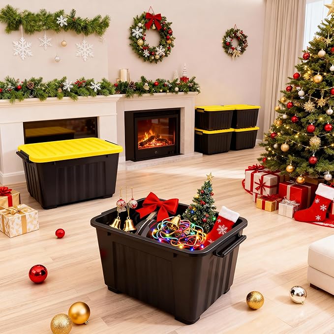 Nazhura 72Quart Plastic Storage Bin, Stackable and Nestable Storage Boxes with White Lids and Secure Latching Buckles, Large Storage Container (Black/Yellow, 72Quart-6Pack)