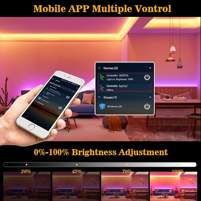 - 【Color Changing & Dimmable】- 3 colors RGB can be mixed into 16 million different colors and the RGB lights controller can be switched colors and adjust 0%-100% brightness light modes. Multiple DIY modes can meet your different mood lighting.