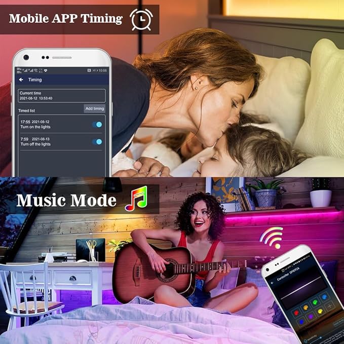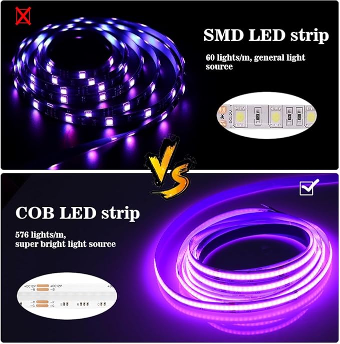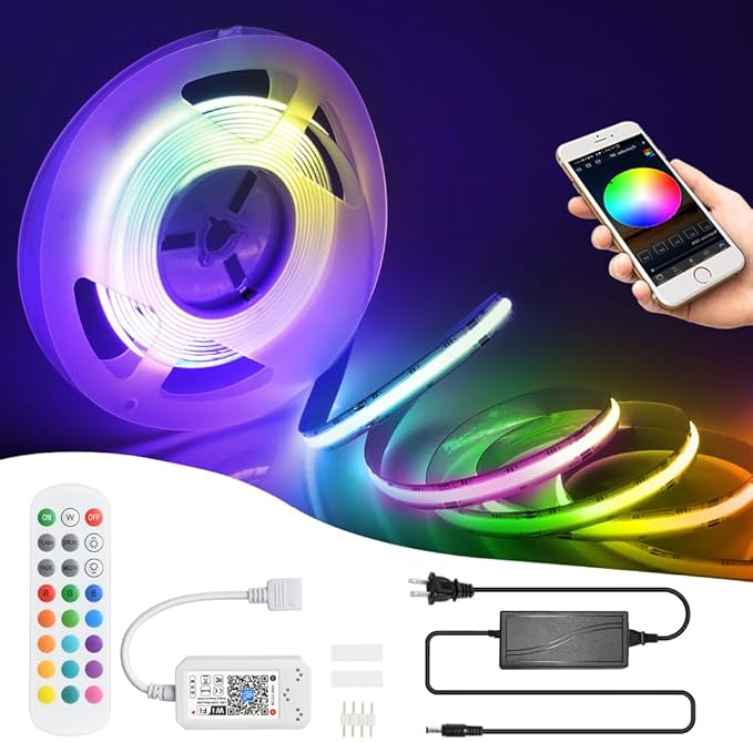 - 【Music Sync & Timing Function】- Built-in high sensitivity mic, RGB COB LED strip lights can synchronize with music.The colors and changing speed will change automatically based on the music rhythm. According to your sleeping time, you can also schedule your led strip to turn on or off automatically in the set time. Light up your life with this COB RGB Led Strip and makes life more colorful.