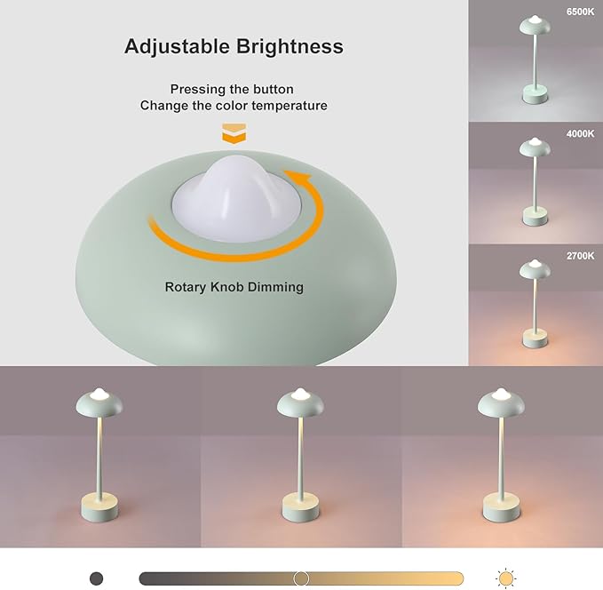 - ⚡️ Touch Control with 3 Color Modes & Stepless Dimming:Customize your ambiance effortlessly: One-Touch Operation: Press to cycle through 2700K (warm), 4000K (neutral), and 6500K (cool white). Intuitive Dimming: Twist the knob for smooth brightness adjustment from soft nightlight to 500-lumen task lighting. Kid-Friendly Design: Fun mushroom shape with soft, flicker-free light ideal for nurseries or reading corners.