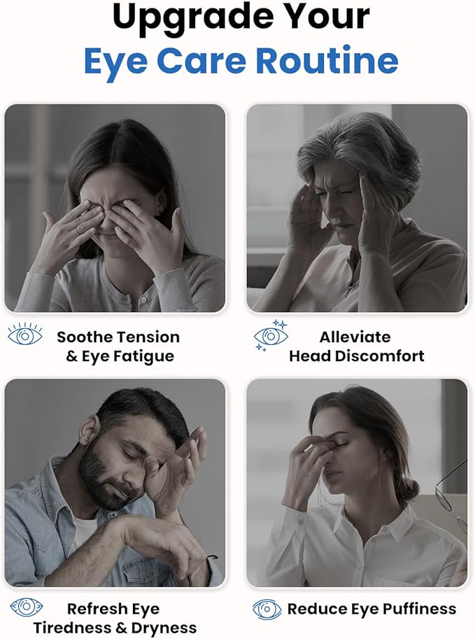 - Soothing Heat Therapy for Ultimate Comfort- Experience the ultimate relaxation with adjustable 3-level compression and 2-level heat settings. Choose from soft, moderate, or strong compression intensity to suit your needs. You can also enjoy the soothing warmth of 104℉(Low Heat) for a gentle effect or go for a deeper heat of 113℉ (High Heat) to help egulate the metabolism and improve blood circulation, relieve eye fatigue, improve the symptoms of dry, sore and sleepy eyes, reduce eye puffiness