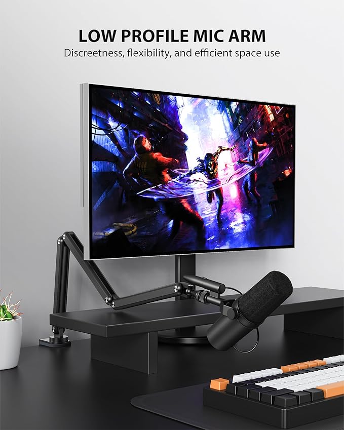 - Three-Section Arm with Multiple Adjustable Angles: Three-stage upgraded mic arm with a maxmum height of 26.77 in/68 cm is ideal for higher angles and longer distances. Also the mic boom arm supports low profile angle, so you can use it from underneath your monitor. 5 adjustable angle joints (including 1*70-90°, 3*270°, 1*240°), 1*360° gimbal. Bend the arm and turn the stand, you can adjust the microphone to the suitable angle or height to show your voice.