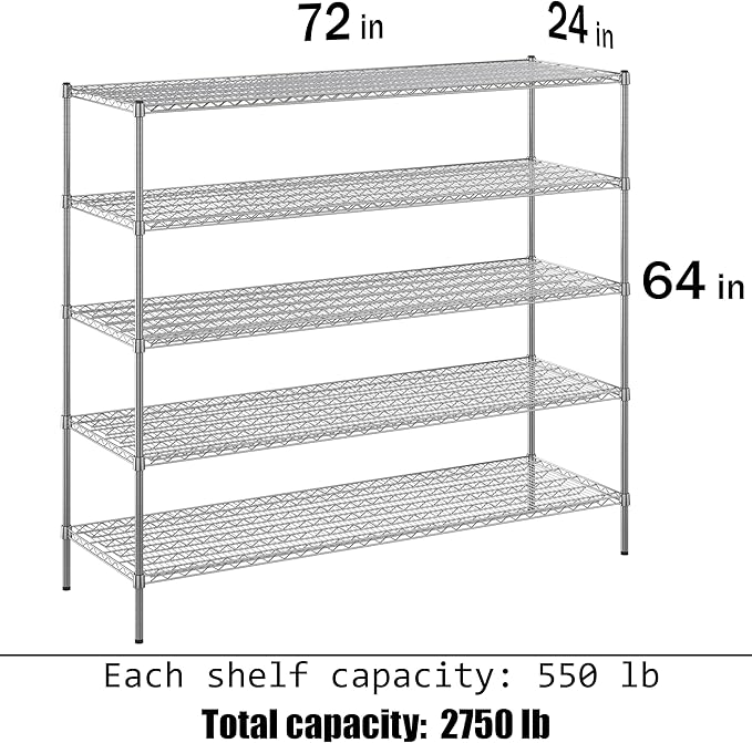 24" Deep x 72" Wide x 64" Height Wire Shelving Kit | 5-Tier | NSF Commercial Storage Rack Unit