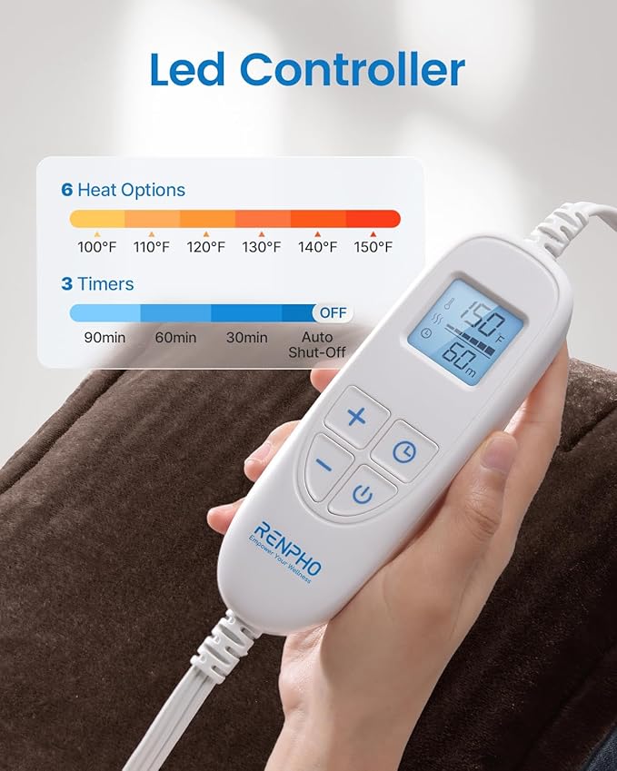- 6 Heat Options & 3 Timers: Electric heating pad for back pain relief control how warm you want to be with built-in 6 heat settings to relieve muscle tension, stiffness, cramp, and more. Choose the timer between 30, 60, and 90mins to customize your relaxing experience.