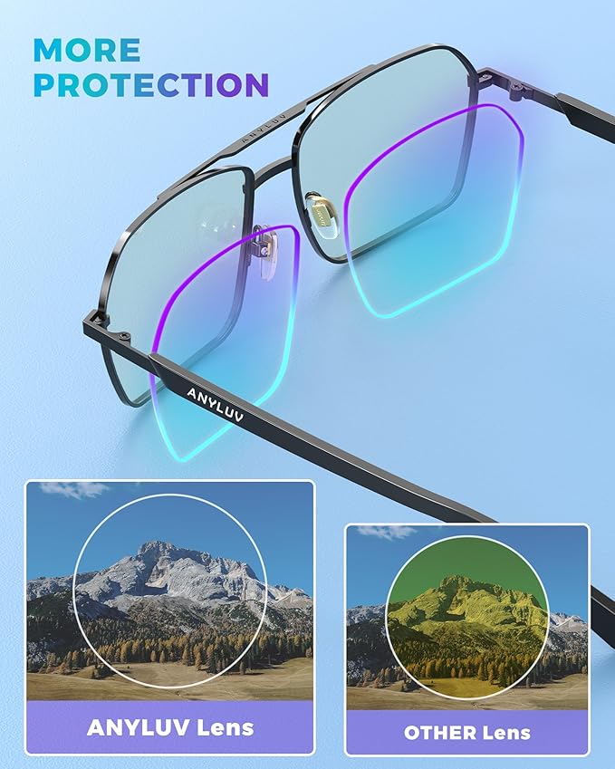 - Trendy Blue Light Glasses: Designed with square slim frame and ANYLUV logo decor temple, very exquisite and fashion style. These anti blue light glasses help show a sophisticated look that complement any outfits, whether you're working or casual daily life