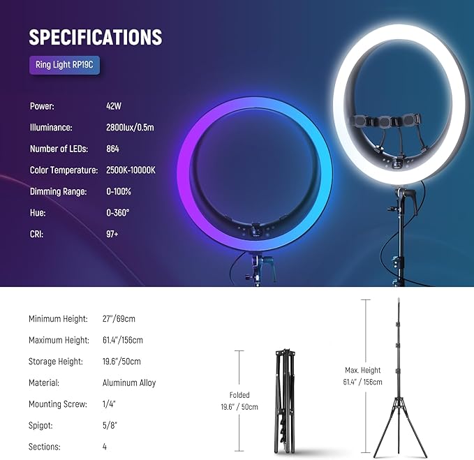 - 【Versatile 19" RGB LED Ring Light】 RP19C is a 19" large RGB ring light for makeup, live streaming, Zoom calls, video conferencing, and selfies. With 864 LEDs, 42W output, 0-100% dimming, 2800lux/0.5m illuminance, CRI 97+, and a circular shape, it produces a bright, diffused, and flexible light source with accurate color reproduction for everyday creations