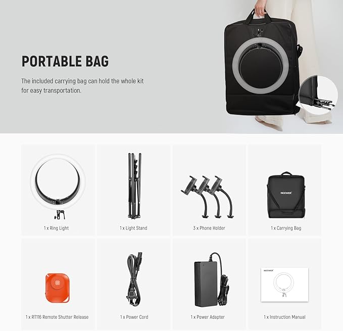 - 【Reversible & Foldable Light Stand】 The supplied light stand with a 2.2-6ft/67-180cm height adjustment range can place your light overhead or at eye level. The stand legs can fold upward and fit inside the carry bag for effortless storage and transportation