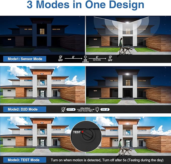 - 【3 Lighting Modes】Mode1: Sensor Mode, turns on when motion is detected. Mode2: D2D (Dusk to Dawn) Mode, automatic turn on at night, automatic light off during the day. Mode3: TEST Mode, turn on when motion is detected, Turn off after 5s.