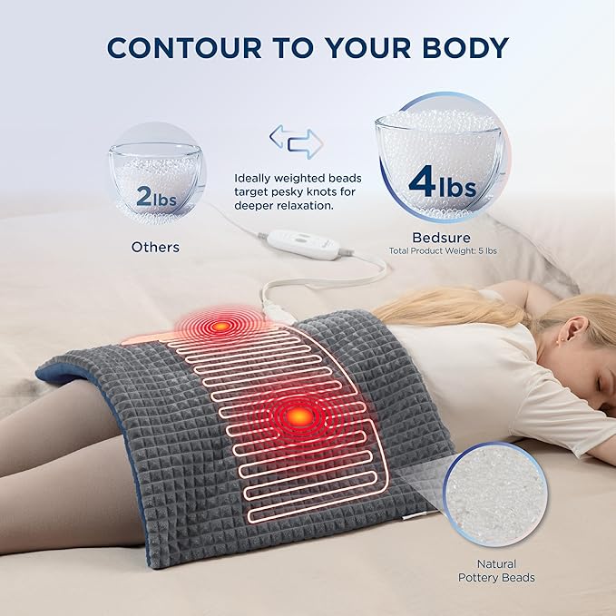 - MASSAGE-LIKE COMFORT: Indulge in a relaxing massage with the 6.3 lbs Bedsure Weighted Heating Pad, designed with a vibrating function and filled with natural pottery beads. Its blanket-like shape allows you to effortlessly drape it over any area of discomfort, providing instant relaxation and a cozy embrace