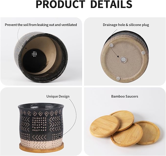 TAMAYKIM 5.5 Inch Ceramic Plant Pots Sets with Drainage Holes, Retro Style Black Flower Planter Pot with Saucer for Indoor Outdoor Succulent, Snake Plants, Cactus & Herbs, Set of 4