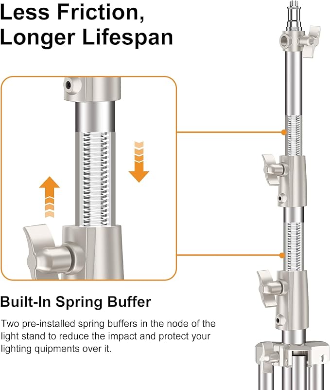 - 【Less Impact & Dual Springs】The heavy duty light stand comes with two spring buffers built in the pole, effectively minimizing the friction and impact when failling down, and ensuring the utmost protection for your valuable photography gears.