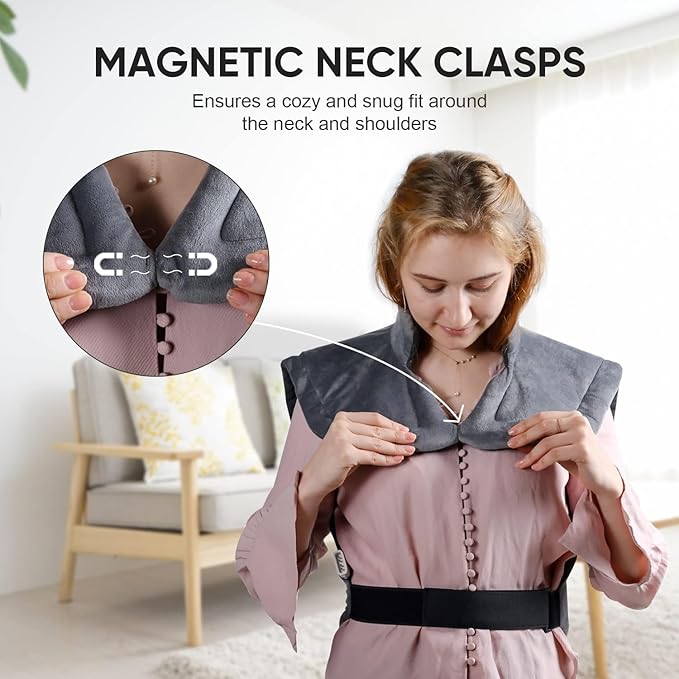 - WEIGHTED DESIGN: The heating pad is filled with miniature glass beads that are evenly dispersed throughout the pad, weighted design greatly improves the heating experience. This wearable electric heating pad for back pain relief is big enough to fit most body shapes. Our back heating pad stays in place around your whole back, neck and shoulder with magnetic clasps and adjustable waist strap (support to 53" waist size). It effectively relieves neck, shoulder, and upper back pain, eases muscle tension and soreness. Additionally, it can be applied flexibly to the abdomen and waist to help relieve period cramps. An ideal gift for mom dad.