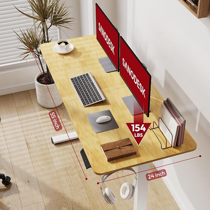 SANODESK Electric Standing Desk 55x24 Inch Height Adjustable Stand Up Desk Home Office Computer Workstation Sit Stand Home Office Desk with Splice Board (White Frame + Maple Top)