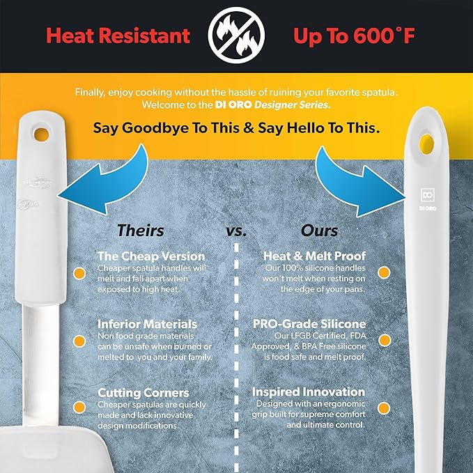 - ONLY THE BEST – By popular demand, we have added a Silicone Ladle to our Award-Winning Seamless Series line of kitchen utensils. The Di Oro Seamless Series Ladle is made with food grade, BPA Free, and LFGB Certified Silicone. Built to withstand the heat, this ergonomically designed tool is heat-resistant up to 600°F, which means you will never melt your favorite kitchen utensil.